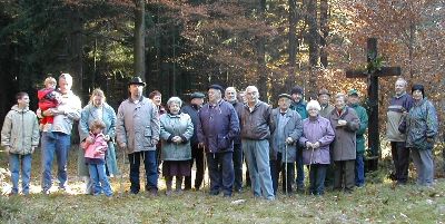 Traditioneller Gang zum Kreuz Bei herrlichem Herbstwetter veranstaltete die Kolpingfamilie am 9. November den traditionellen Gang zum Kreuz auf die "Höhe". Die zahlreichen Wanderer, groß und klein wurden für die Strapazen auf dem inzwischen fast unpassierbar gewordenen Traditionspfad durch die herrliche Natur in dem sonnendurchfluteten Herbstwald entschädigt. Am Kreuz auf der Höhe sammelte man sich zu einem gemeinsamen Gebet. Eine besondere Überraschung bot der erste Vorsitzende, Gerhard Jung, der die Wanderer mit einer Zwischenmahlzeit in Form eines Obstlers stärkte, - eine kleine Nachfeier seines am Vortag gefeierten 70ten Geburtstags. Anschließend marschierte man zurück nach Langweiler, wo bei geselligem Beisammensein im Pfarrheim bei Kaffe und Kuchen die Veranstaltung harmonisch ausklang.